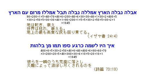 40+200+300+600+5+200+500=1845になりました。1845という数字は、……これは、旧約聖書におけるあるフレーズと、また別のフレーズの数字に、丸々対応しています。つまり、イザヤ書24:4および詩篇73:19です。