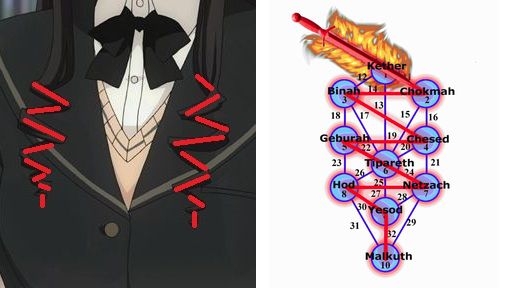 生命の樹、または、セフィロトと呼ばれる事もある樹形図です。王冠ケテルから王国マルクートへ流れる聖性の象徴と、はるかちゃんの髪型との一致。南方ぁ、カバラを使えよぉ、カバラで読み取れよぉと、ぼくに語りかけているかのようです。